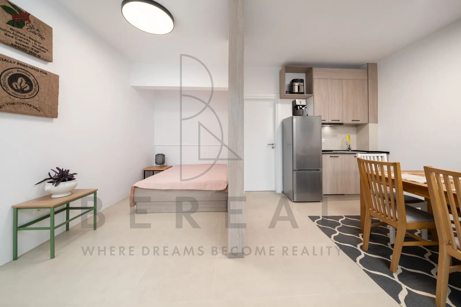 Living: Φωτεινός ενιαίος χώρος σαλονιού-κουζίνας με minimal design και έμφαση στη λειτουργικότητα.