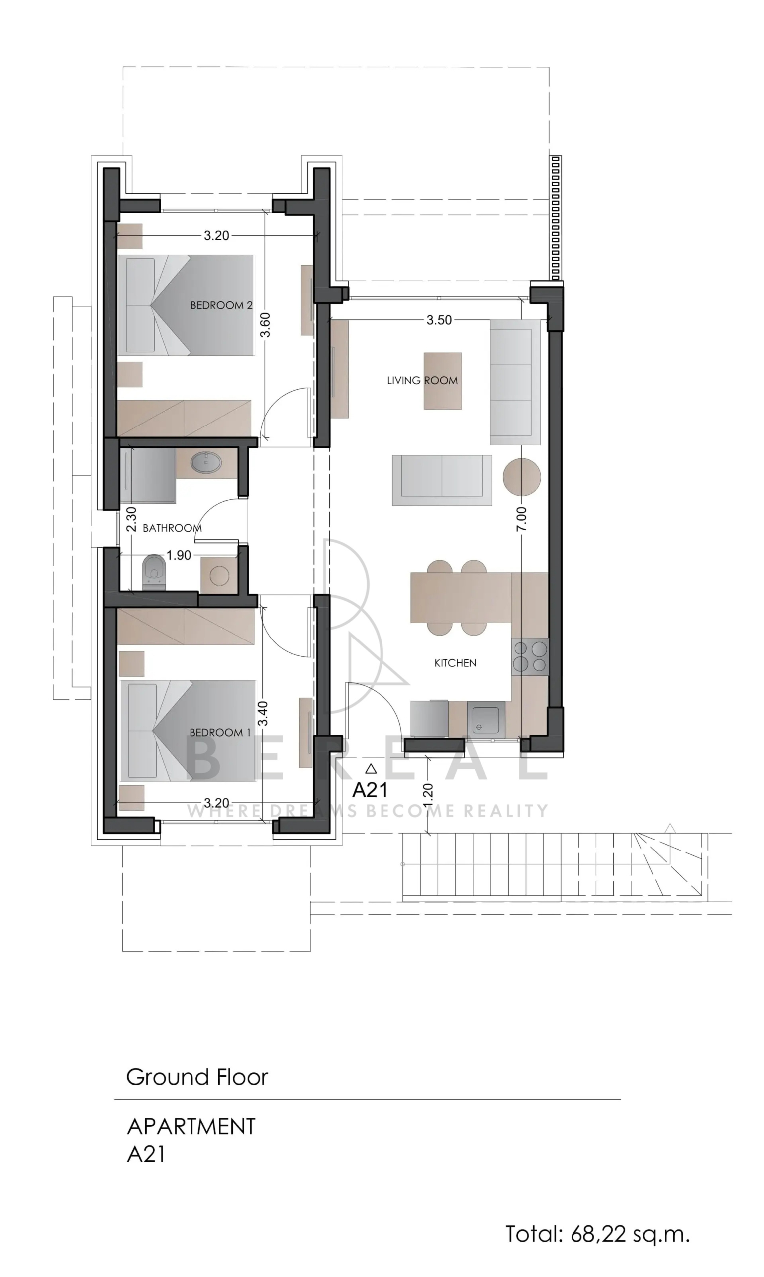 The property has a total area of 68.22 sq m. and is located on the Ground Floor of a complex. The house is on one level and is distinguished by its functional and comfortable layout. It includes a single, bright living room-kitchen, two (2) spacious bedrooms and one (1) full bathroom.